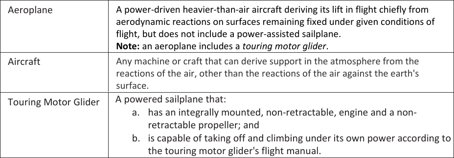 Definition of Aeroplane added, which corresponds to the definition applied in the Civil Aviation Safety Regulations (CASR).