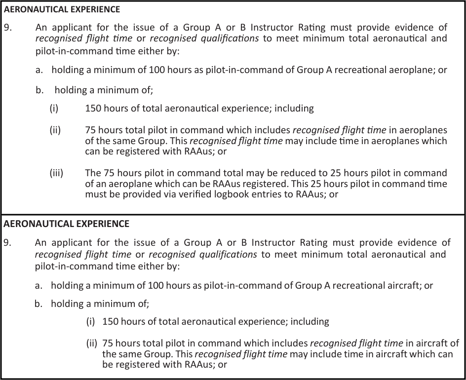 Paragraph 9. b. (iii). has been removed, which permitted a reduction to 25 hours Pilot in Command of an aircraft which can be RAAus registered as a minimum aeronautical experience for the issue of an instructor rating.